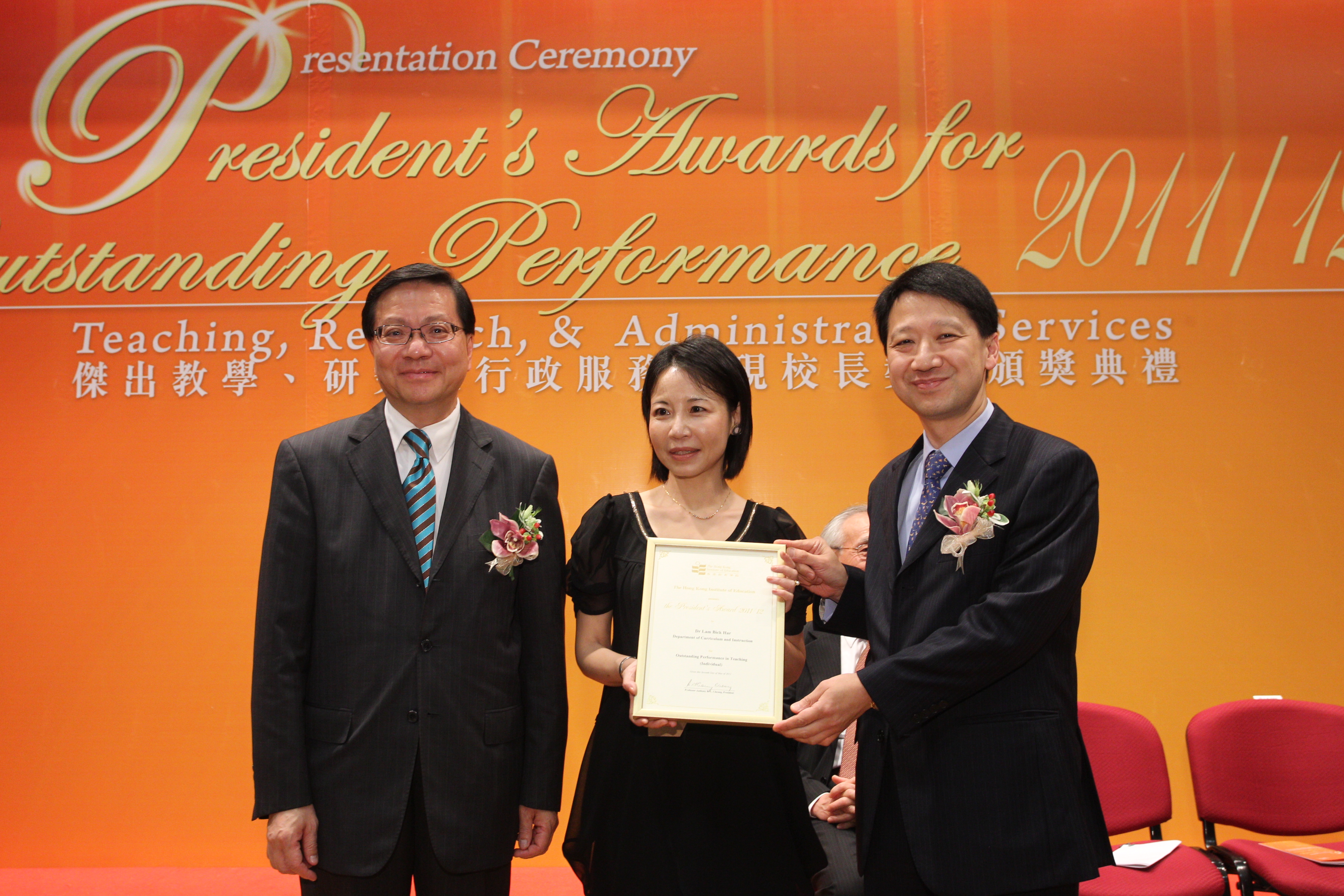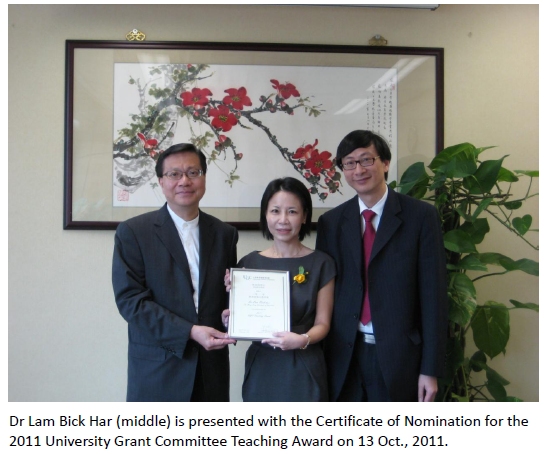 Dr Lam Bick Har (middle) is presented with the President's Award for Outstanding Performance in Teaching 2011/12